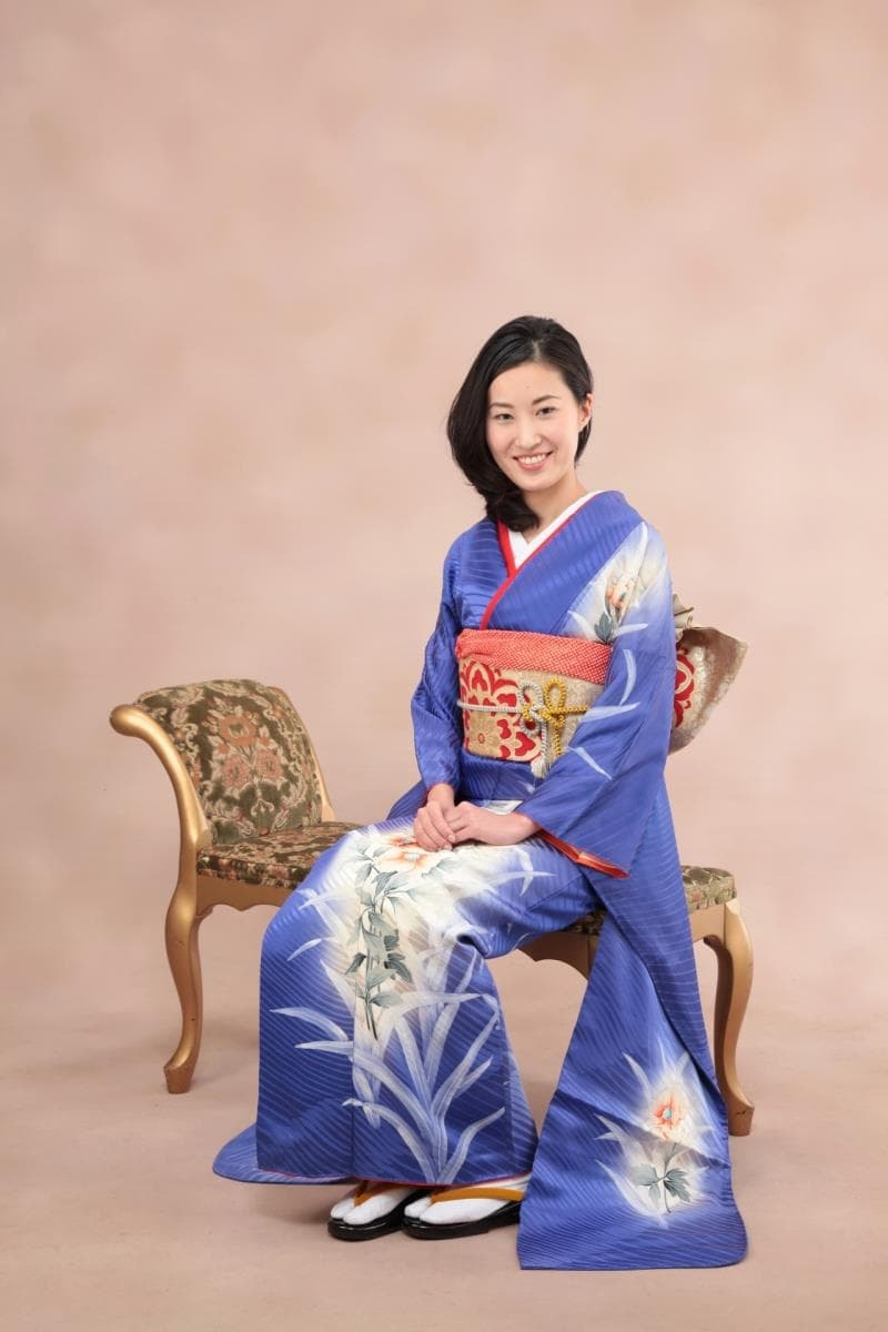 背筋を伸ばして立ち、重心はつま先にかけます。着物の裾が足にかかるように左足は軽く引きます。目線は6mほど先の地面をみるように落とし、写真撮影の時はカメラに対して体を30度ほど右に向けるときれいにみえます。